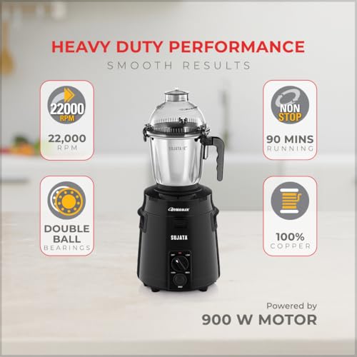 900W double ball bearing motor with 22,000 RPM — grinds turmeric, dal batter, and tough masalas effortlessly